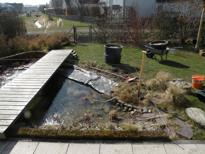 Es soll ein Eck dazukommen, das aber komplett vom übrigen Teich getrennt ist. Hier soll später Filterkies hinein, in den Pflanzen gesetzt werden. (02.03.2011)