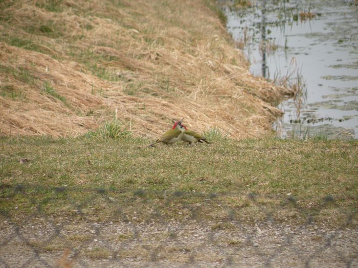 Diese beiden Grünspechte pickten zunächst gemeinsam Ameisen aus der Erde. Dann änderte sich jedoch ihr Verhalten und sie verharrten längere Zeit in einer eigenartigen Stellung (s. Photo). Als dann plötzlich der eine auf dem anderen hockte, wurde auch mir klar, was dem vorangegangen war.