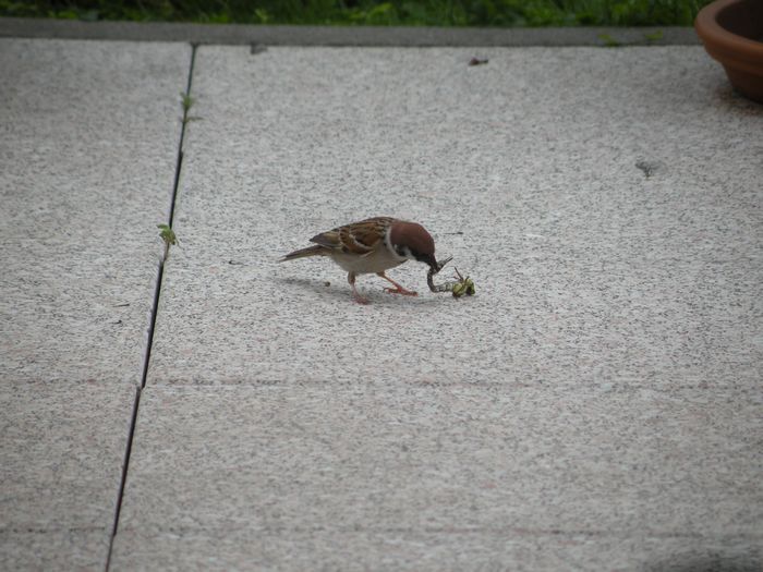 Der Feldsperling hat mit einer Libelle einen dicken Brocken erwischt und kämpfte dementsprechend lang, ihn zu zerlegen. (02.07.2011)