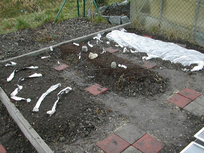 Die Alustreifen und das Drahtgeflächt dienen nicht als Vogelscheuche - sie halten Nachbars Katze davon ab, die Beete als Katzenklo zu verwenden. (10.03.2007)