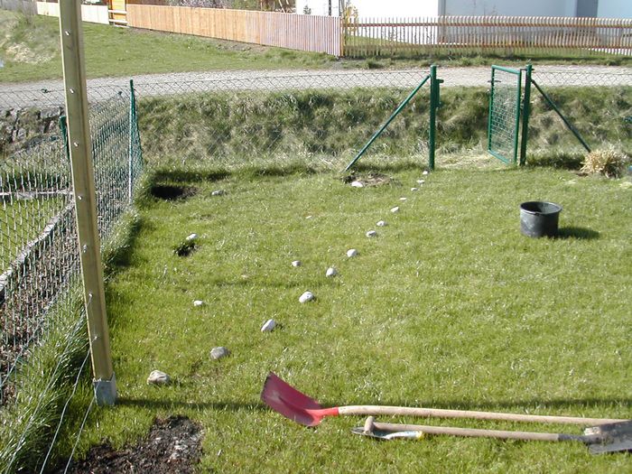 Hier soll der Bambus hin. Grassode austechen, Pflanzlöcher graben und mit Rindenmulch auffüllen. (05.06.07)