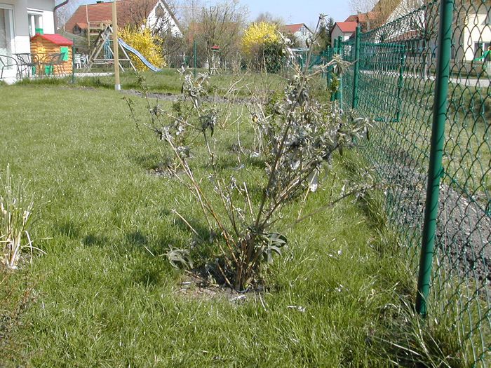 Der Sommerflieder kümmert vor sich hin. Links am Bildrand sieht man das neu eingesetzte, noch völlig zurückgeschnittene Gras. (09.05.07)