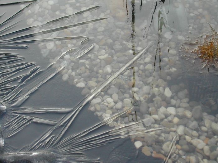 Nachdem ich gestern den Jasmin gestutzt und in eine dicken Laubballen, umhüllt von Noppenfolie gepackt hatte, war heute morgen das erste Eis auf dem Teich. Nachttemperatur: -3 Grad.