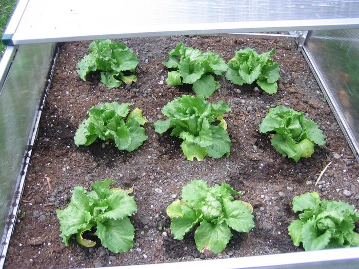 Der ist auch schon ordentlich gewachsen und fängt bereits an, einen Kopf zu bilden. Heute habe ich dann nochmals 12 Pflanzen gesetzt, mutig wie ich bin, gleich ins Beet (in den Teil, der durch den Schneckenzaun geschützt ist). Vlies drüber und abwarten - Schnee sollte jetzt möglichst nicht mehr kommen.