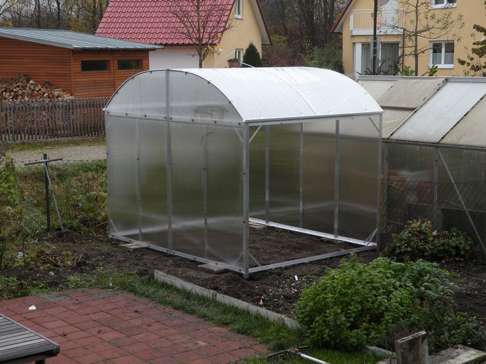 Mit nachbarschaftlicher Hilfe wurde das Gewächshaus von der Terrasse an seinen eigentlichen Bestimmungsort gebracht. Jetzt muß es noch ausgerichtet und mit den Erdankern in die Punktfundamente einbetoniert werden.