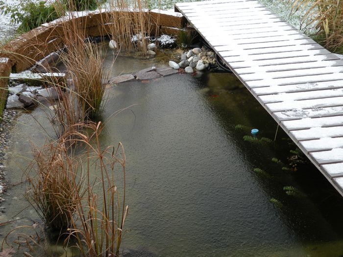 Das erste mal in diesem Jahr ist der Teich zugefrohren. Er taut auch erst am 6. Dezember wieder auf, kalte gut 14 Tage also. In einigen Nächten zeigte das Min-/Max-Thermometer gut -8 Grad.