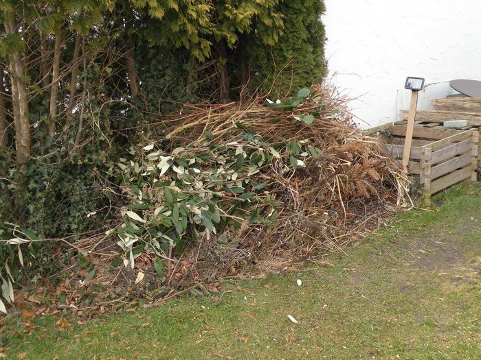 Ursprünglich sollte ein Haufen aus Ästen und Zweigen z. B. Igeln oder Kröten als Winterquartier dienen. Nachdem ich heute kräftig an Nachbarins Büschen und Bäumen geschnitten habe, wächst mir das Winterquartier langsam buchstäblich über den Kopf. Ich werde es noch bis zu Frühsommer liegen lassen (falls sich wirklich jemand einquartiert hat, ist er dann sicher weg) und ihn dann ein bißchen abtragen.