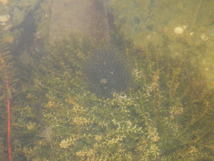Der erste Froschlaichballen ist im Teich. Nachdem ich mich heute in der Mittagspause bei einem Gang zum Teich wunderte, "den" Frosch an einer gänzlich ungewöhnlichen Stelle anzutreffen, fand ich jetzt am Abend die Erklärung. Er (oder sollte man besser sie sagen) war in diesen Teil des Teiches gekommen, um abzulaichen.