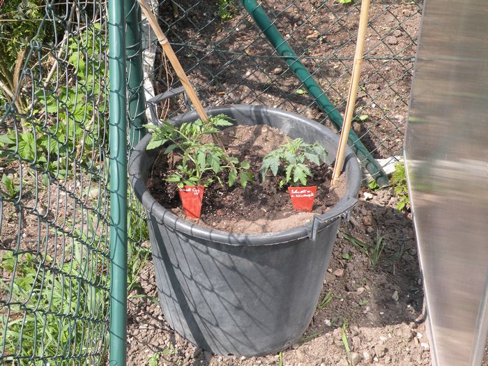 Die beiden dienen dem Feldversuch: nicht im Tomatenhaus, nicht überdacht, aber im Kübel. Mal sehen, wer das Rennen macht. (21.04.2009)