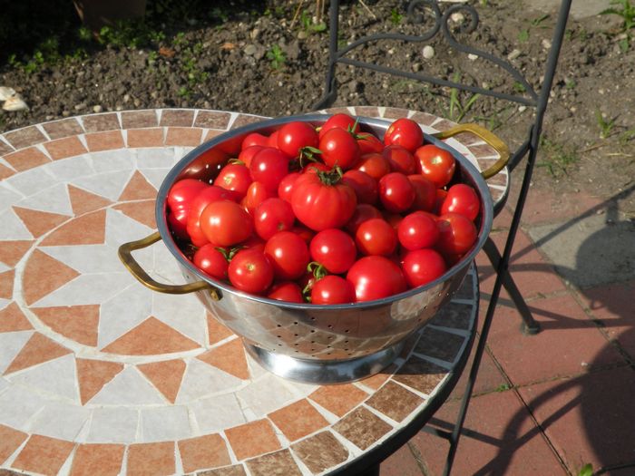 Die Ausbeute der heutigen Ernte schreit nach Massenverarbeitung. Und immer noch hängen die Tomatenpflanzen voller Früchte. Ich glaube, das wird ein gutes Jahr. Die "Versuchstomaten", die außerhalb des Tomatenhauses stehen, hat die Kraut- und Braunfäule schon gut erwischt. Etliche Früchte mußte ich entsorgen. Im Tomatenhaus ist davon noch nichts zu sehen.