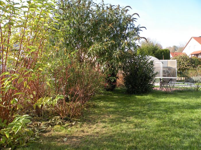 Die Blauraute ist zurückgeschnitten, der Flieder verliert seine Blätter - es wird Herbst. Nach einem wunderschönen Sonnentag, den wir bis 16 Uhr auf der Terrasse verbracht haben, zieht nun der Nebel auf. Die Kübelpflanzen sind abgedeckt, die Kräuter stehen im Tomatenhaus - es wird jetzt nicht mehr allzuviel im Garten zu tun geben.