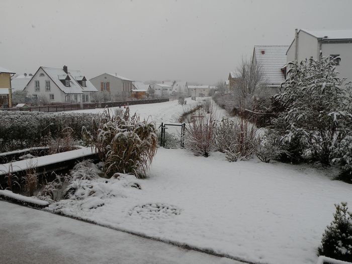 Nachdem am 10.12. erstmalig der Teich zugefroren war, hat es nun, wenn auch wenig, geschneit. (12.12.2009)