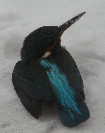 Ich sitze in meinem Büro (mit Blick durch die Terrassentür auf den Garten), als ich plötzlich durch zwei, ganz kurz hintereinander folgende, dumpfe Schläge hochschrecke. Erst dachte ich, die Kinder hätten Schneebälle an die Tür geworfen, doch dann sah ich den Eisvogel direkt vor der Tür sitzen. Als ich hinging, sah ich auch den zweiten, der sich aber offenbar schnell erholt hatte, denn er flog weg. Der andere war noch ein wenig benommen, so dass ich ihn durch die Scheibe der Tür photographieren konnte. Glücklicherweise flog auch er dann nach wenigen Minuten von dannen.