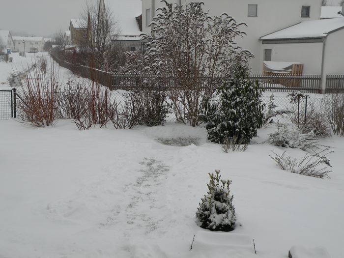 Es hört und hört nicht auf. Jetzt schneit es (in ganz kleinen Flocken) seit gestern morgen. In der vergangenen Nacht ging die Temperatur bis auf -8,4°C zurück. Die für die Vögel freigefegte Futterfläche vor dem Flieder, in dem noch Meisenknödel hängen, ist stark frequentiert. Zeitweise tummeln sich dort bis zu zehn Vögel (Amsel, Feldsperling, Kohlmeise) gleichzeitig.