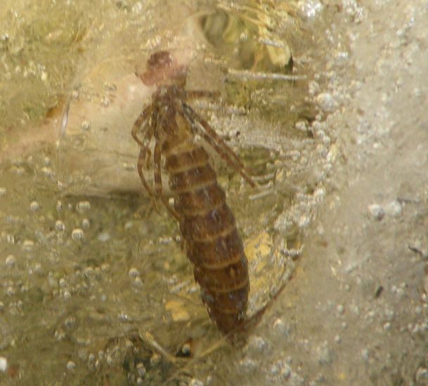 Gestern und heute hatte es 17°C, in der Sonne 30,5°C bzw. 37°C (vielleicht spinnt mein Thermometer auch, aber es war wirklich richtig warm auf der Terrasse). Jetzt offenbaren sich die ersten "Tragödien", die Libellenlarve ist im Eis aber gut erhalten.