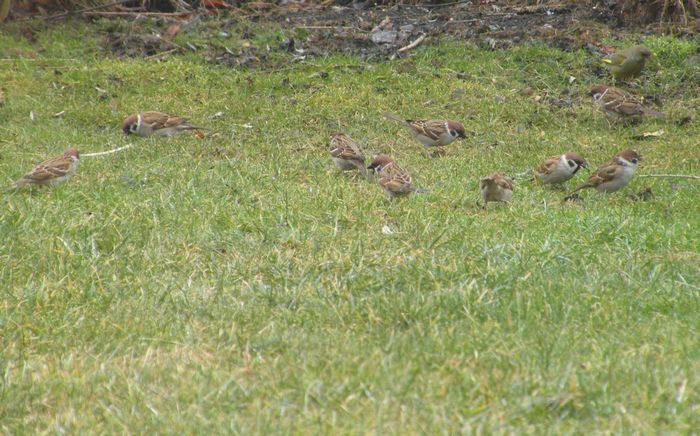 Auf dem Flecken Wiese, das ich im Winter schneefrei gehalten hatte und dort Futter streute, scheint noch einiges übrig geblieben zu sein. Feldsperlinge, Grünfinken (beide auf dem Bild), Buchfinken, Goldammern, Blaumeisen, Kohlmeisen, Rotkehlchen und Amseln kommen noch regelmäßig.