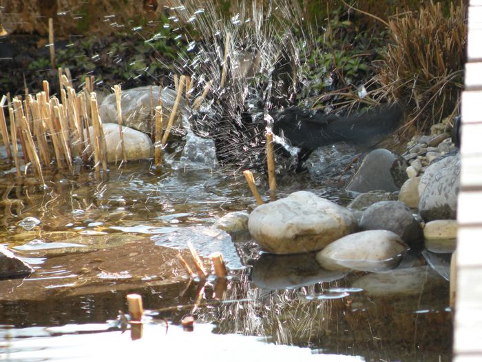 Die Amsel ist kaum zu erkennen, die Auswirkungen ihrer Badelust hingegen schon. (25.03.2010)
