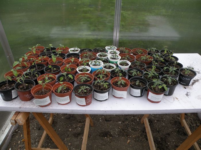 Damit alle Abnehmer (Anna, Barbara, Nanerle (alle A), Bärbel, Kerstin, Harry (alle D)) der Tomaten schon mal eine Qualitätskontrolle per Augenschein durchführen können - sie stehen jetzt im Tomatenhaus, da sie inzwischen auch ein bißchen wie Tomaten aussehen.