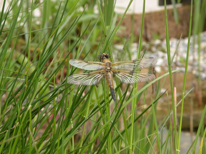 Einige Stunden später sind die vier Flügel zu erkennen, sie hängt aber immer noch an der selben Stelle (dank Andy Angerer aus der Newsgroup de.rec.garten weiß ich jetzt auch, was für eine Libelle das ist: Vierfleck).