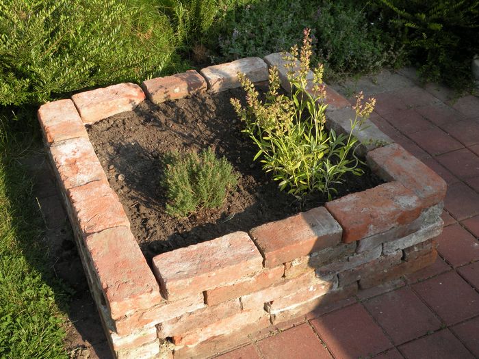 ...und hier mit den ersten Pflanzen. Zitronenthymian und Rosmarin fehlen noch. Alle Kräuter sind im Topf eingegraben, damit ich sie im Winter in den Keller stellen kann.
