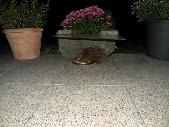 Aufgrund eines Hinweises des NABU habe ich die Futterstelle auch über den Winter hin weiter versorgt. Es kommen auch viele Vögel, trotzdem wunderte ich mich, daß die Körner jeden Tag so schnell weg waren (v.a.D. die in der Vogelfuttermischung enthaltenen größeren Körner). Heute Nacht habe ich das Rätsel lösen können.