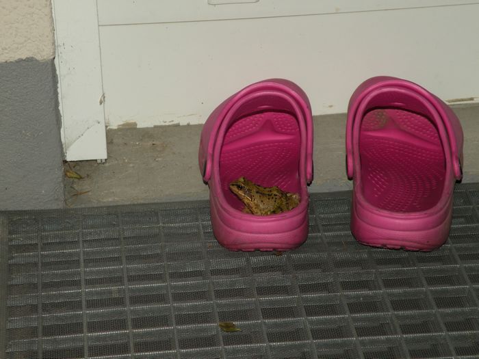 Abends auf der Terrasse erlebt man immer wieder mal Dinge, die man tagsüber so nicht beobachten kann. Dieser Grasfrosch machte es sich mal gemütlich in den Gartenschuhen von Andrea. Gut, daß sie nichts davon weiß, wenn sie morgen in selbige steigt.