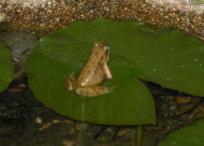 Wenigstens einer, der sich anständig benimmt - sitzt auf einem Seerosenblatt und quakt. (20.08.2010)