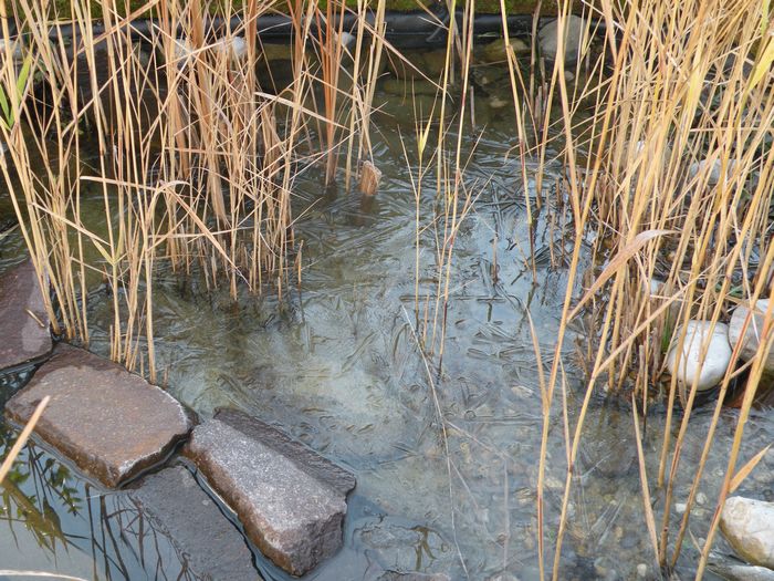 Nach einem sonnigen Nachmittag fiel die Temperatur in der Nacht auf -4,5°C, die erste Eisschicht auf dem Teich war die Folge. (22.10.2010)