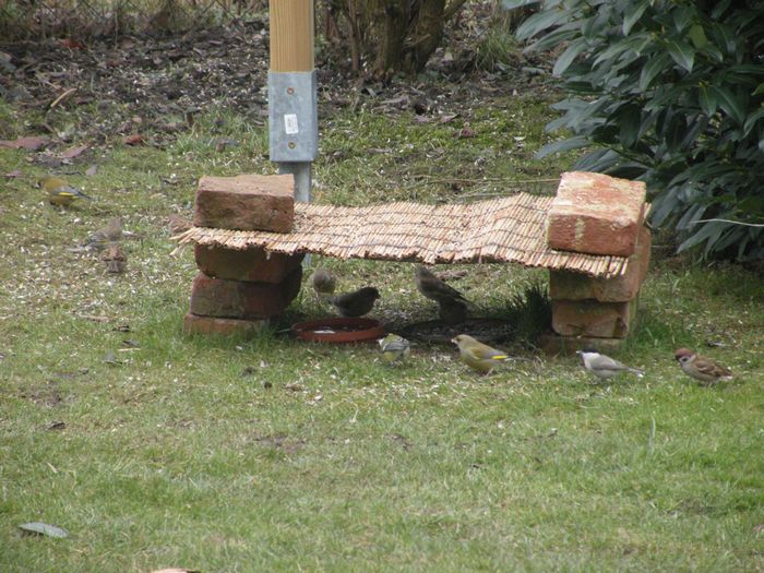v.l.n.r.: Kohlmeise, Grünfink, Sumpfmeise, Feldsperling. Dompfaff, Amsel, Buchfink und Blaumeise waren zur selben Zeit auch noch da - habe sie aber nicht alle auf ein Photo bekommen.