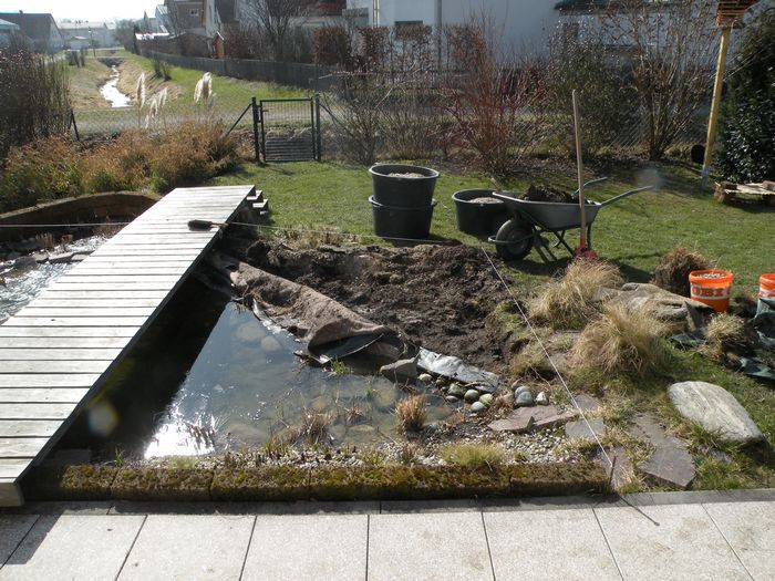 Das Becken ist ausgehoben, ein Stück alte Folie und Vlies müssen noch abgeschnitten werden. (02.03.2011)
