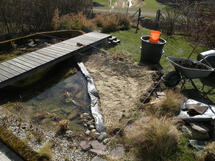 Für das kleine Becken spare ich mir das Vlies und bedecke die Fläche lediglich mit Sand. Hier noch eine kleine Anekdote: beim Obi kostet ein 20 kg Sack Sand EUR 1,60. In der Kiesgrube, wo ich diesen Sand gekauft habe, bezahlte ich unwesentlich mehr (EUR 1,77), allerdings nicht für 20 Kg sondern für 240 Kg.