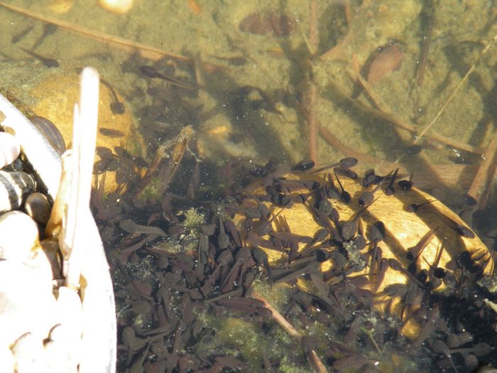 Jetzt sind sie beinahe alle geschlüpft. In den nächsten Tagen werden die kleinsten von den Stichlingen komplett gefressen, den größeren beißen sie einen Teil des Schwanzes ab. Schwimmen können sie dann trotzdem noch, aber nicht mehr so flott.