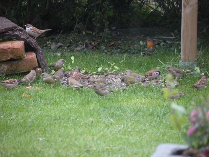 Keine Ahnung, was heute los war - bis zu 30 Vögel gleichzeitig am und im Vogelhaus (Feldsperling, Grünfink, Rotkehlchen, Kohlmeise, Blaumeise) (26.10.2011)