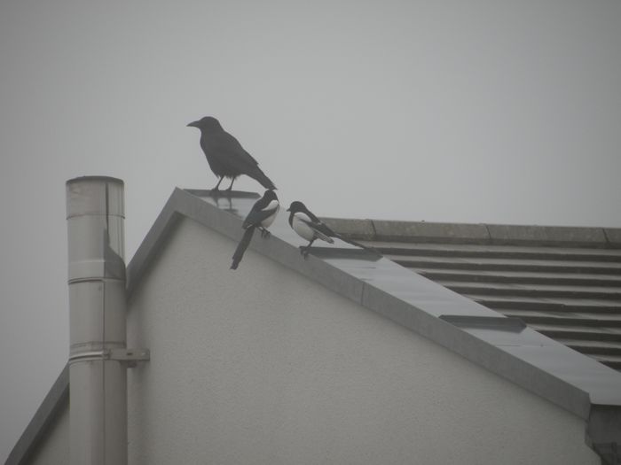 Diese Kombination habe ich hier noch nicht gesehen: Krähe einträchtig neben zwei Elstern. Vielleicht schmieden sie schon Partnerschaften für den kommenden Winter. (04.11.2011)