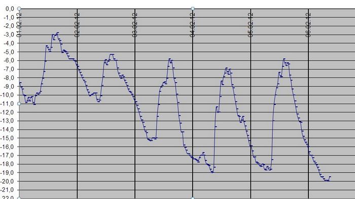 Der Februar beginnt eisigkalt. Hier die Temperaturkurve der ersten 5 Tage. Mittlere Temperatur -11,4°C, Tiefstwert -20°C. (06.02.2012)