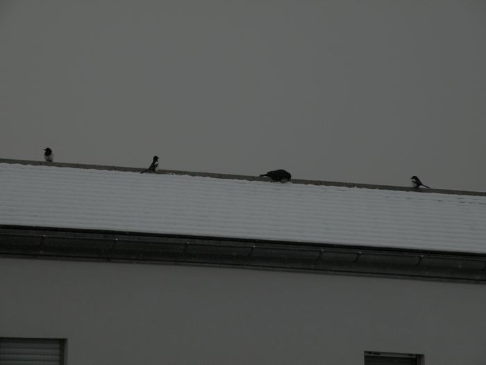 Die Krähe hatte Futter gefunden, die Elstern sahen das wohl eher als Allgemeingut an. (07.02.2012)