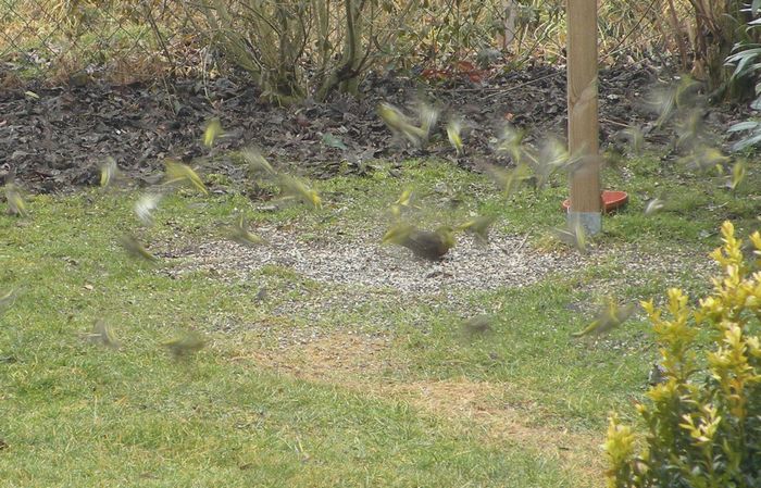 Wie auf Knopfdruck flogen alle Erlenzeisige weg, nur die Amsel bleibt, in leicht geduckter Haltung, sitzen. (03.03.2012)