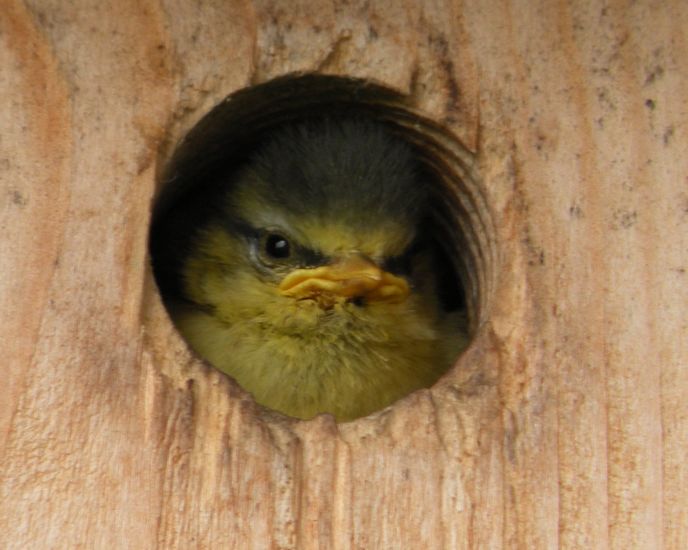 Was soll uns der Gesichtsausdruck des Blaumeisenkükens beim ersten Blick durch das Einflugloch sagen? Böse Welt? (22.05.2012)