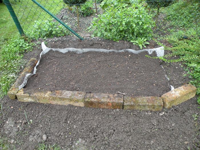 Noch ist es nicht ganz fertig. Ich habe den gesamten Bereich ausgeschachtet und ein Alu-Drahtgeflecht reingelegt. Anschließend die Erde durch das Erdsieb geworfen und ein bißchen Kompost beigemischt. Jetzt sitzen da ca. 50 Tulpenzwiebeln drin und warten darauf, mir das Leben im kommenden Frühjahr zu verschönern.