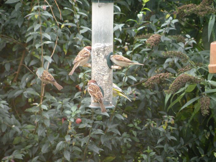 Hier sind alle Futterplätze ausgebucht, 1 1/2m tiefer sitzen ca. 20 Grünfinken und knacken das, was von oben heruntergeworfen wird. (25.10.2012)