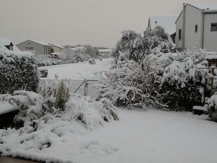 Ja, und so sah es dann aus. Schwerer, pappiger Schnee, der Büsche und Gräser niederdrückte. Ein bißchen schneit es noch, die Temperatur liegt knapp über Null.