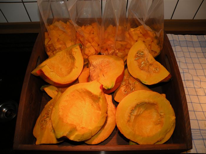 Knapp 50 Portionen Kürbissuppe sind in der Vorbereitung. Insgesamt acht Kürbisse sind für 2 Personen doch eine ganze Menge. Die Pflanze selbst habe ich letztes Wochenende in den Pflanzenhimmel befördert.