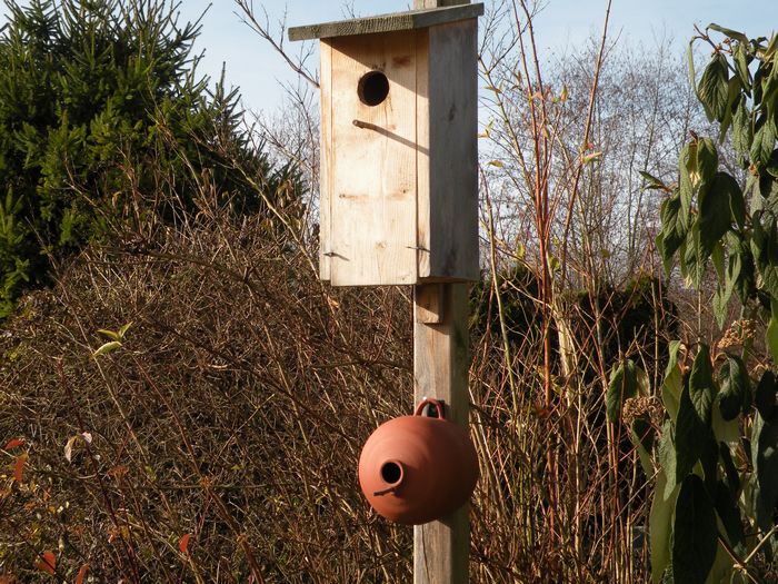 Nachdem der tönerne Nistkasten jetzt ungenutzt ein Jahr am Tomatenhaus hing, habe ich ihn nun mal einfach unter den hölzernen gehängt. Ob es was bringt, wird sich im kommenden Jahr zeigen.