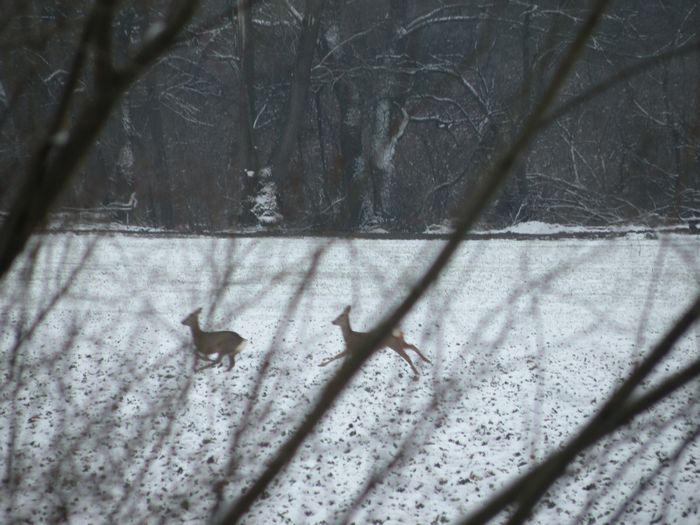 Im wahrsten Sinn des Wortes auf den letzten Drücker habe ich gerade noch zwei von drei Rehen, die mitten am Tag über ein freies Feld liefen, mit der Kamera erwischt.