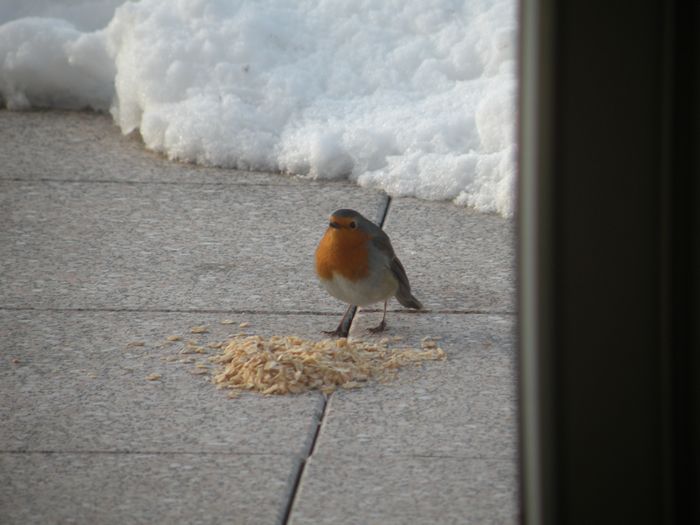 Das Rotkehlchen hat sich auf die Terrasse getraut um von den in Fett ausgebratenen Haferflocken zu speisen. (22.01.2013)