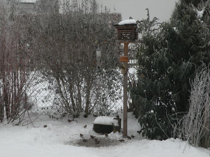 Im Vogelhaus, am Meisenknödel (meist auch noch am Futterrohr) und auf dem Boden - wenn die Feldsperlingsrasselbande einfällt, wird's turbulent. (25.01.2013)