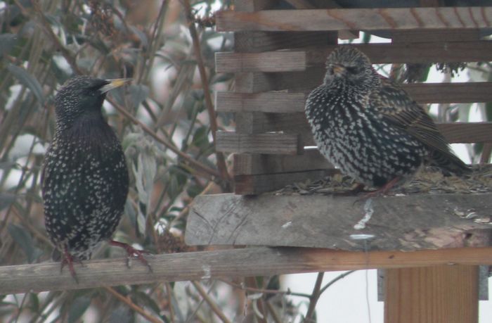 Diese beiden Stare im Schlichtkleid (Perlstar) schauten heute mal vorbei. Vielleicht ist dabei auch ihr Blick auf meinen Starenkasten gefallen, in dem noch nie ein Star gebrütet hat.