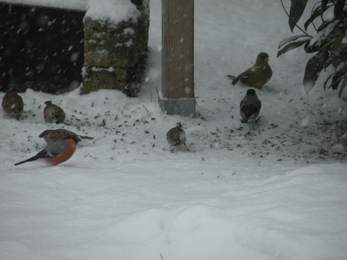 Dompfaff, Feldsperling und Grünfink vereint im Schneetreiben. Langsam reicht's mit dem weißen Zeug. (26.02.2013)