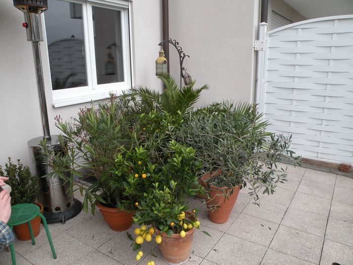 Nachdem der meteorologische und der kalendarische Frühling längst begonnen haben, hatte ich heute die Schn**ze voll. Wir haben die Terrassenblumen aus dem Keller geholt, sie brauchen endlich wieder vernünftiges Licht. Noch schön zusammengestellt, daß ich bei Bedarf eine Plane überwerfen kann. Man achte auf den im Vordergrund stehenden Zitrusbaum ...