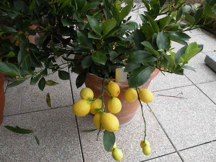 ... als Größenvergleich habe ich mein Zippo-Feuerzeug auf den Rand des Topfes gestellt - die Früchte könnte man als Zitronen im Supermarkt verkaufen. (07.04.2013)